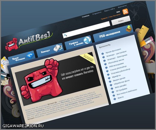 Очень красивый шаблон для сайтов uCoz, сделанный EVILMAN'om - PS-DA. Хорошо подойдет для сайтов про web-дизайн, сайтов дизайнеров, хотя дизайнеры сами могут нарисовать, а затем сверстать шаблон, но все же.
